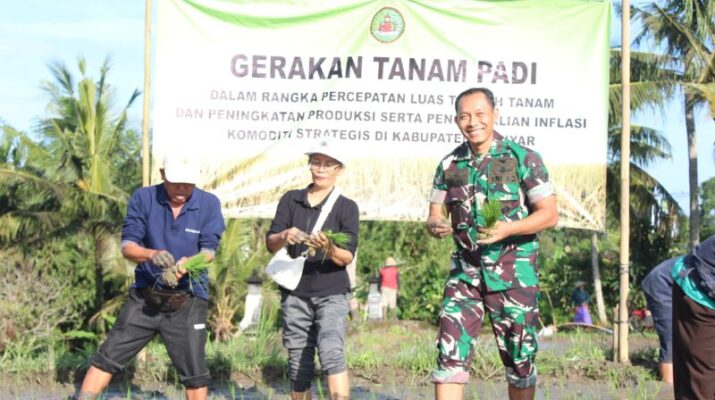 Gianyar – Dalam upaya mewujudkan ketahanan pangan daerah dan menjaga keberlanjutan sektor pertanian di Kabupaten Gianyar, Komandan Kodim 1616/Gianyar, Letkol Cpn I Gede Winarsa, S.H., M.Han., hadir langsung dalam kegiatan penanaman padi di Subak Uma Abian, Desa Peliatan, Kecamatan Ubud, pada Jumat (16/5/2025).